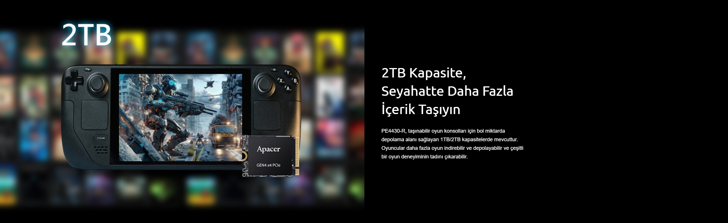 PE4430-R, taşınabilir oyun konsolları için bol miktarda depolama alanı sağlayan 1TB/2TB kapasitelerde mevcuttur. Oyuncular daha fazla oyun indirebilir ve depolayabilir ve çeşitli bir oyun deneyiminin tadını çıkarabilir.