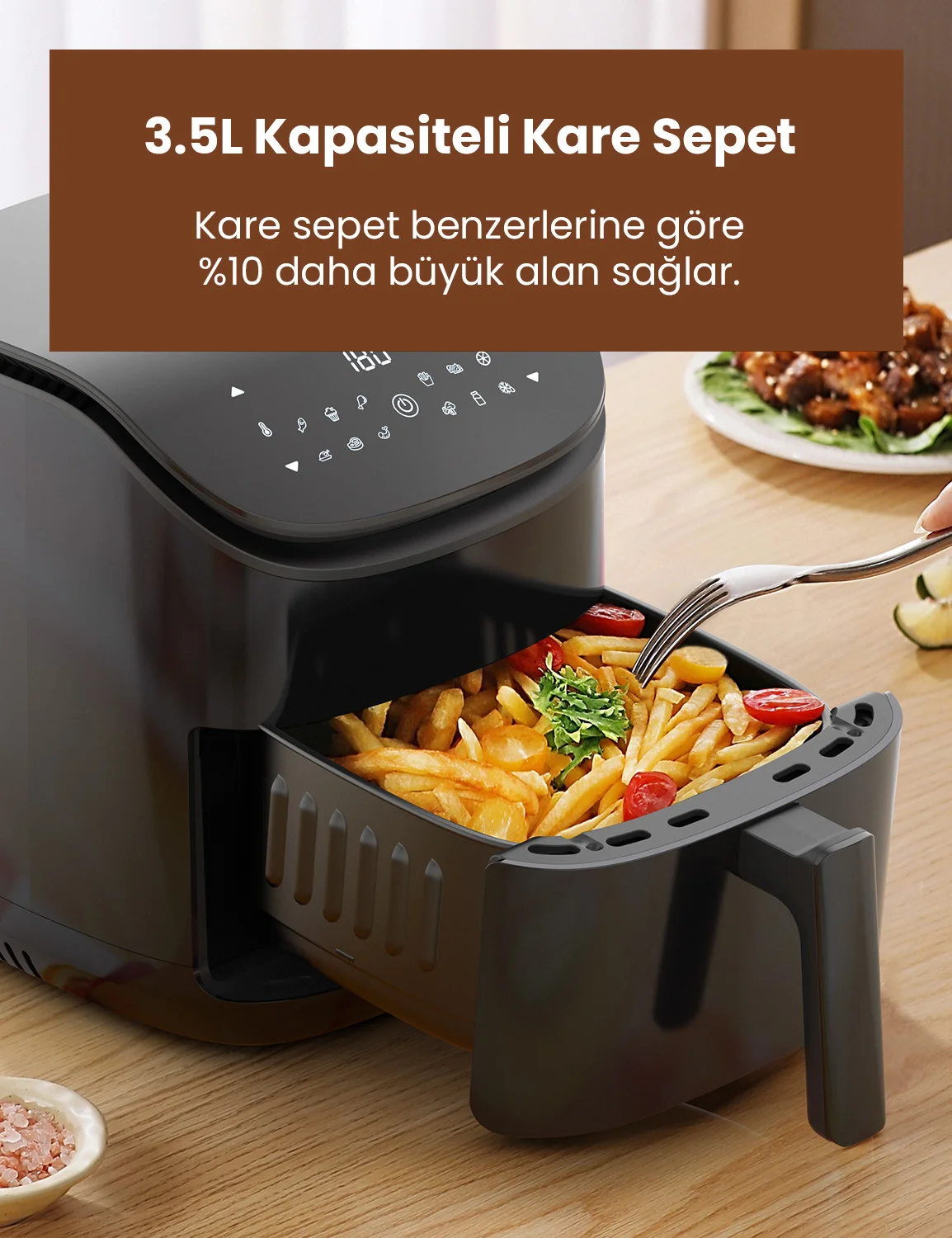 3,5 L kapasiteli patates kızartması sepeti, bir seferde beş porsiyonluk patates kızartması hazırlamanıza olanak tanır. Daha düz kare sepet, aynı hacimdeki yuvarlak sepetlere göre %10 daha fazla pişirme yüzeyine sahiptir, böylece bir sepette daha fazla yiyecek eşit şekilde pişirilebilir.