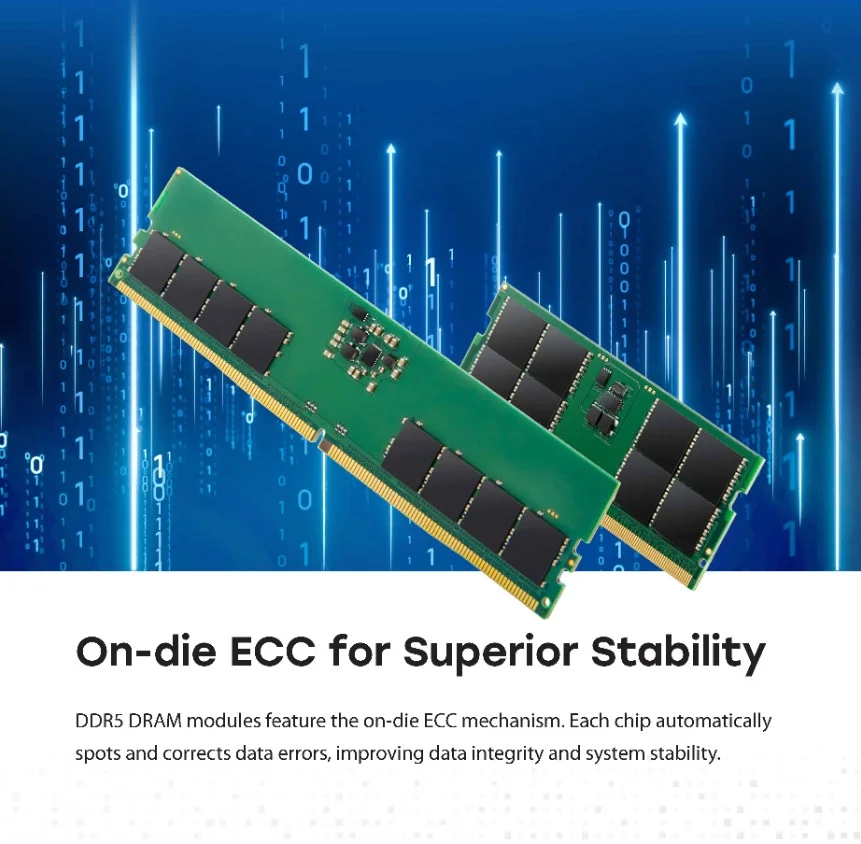 DDR5 DRAM modülleri kalıp üzerinde ECC mekanizmasına sahiptir. Her çip veri hatalarını otomatik olarak tespit edip düzelterek veri bütünlüğünü ve sistem kararlılığını artırır.