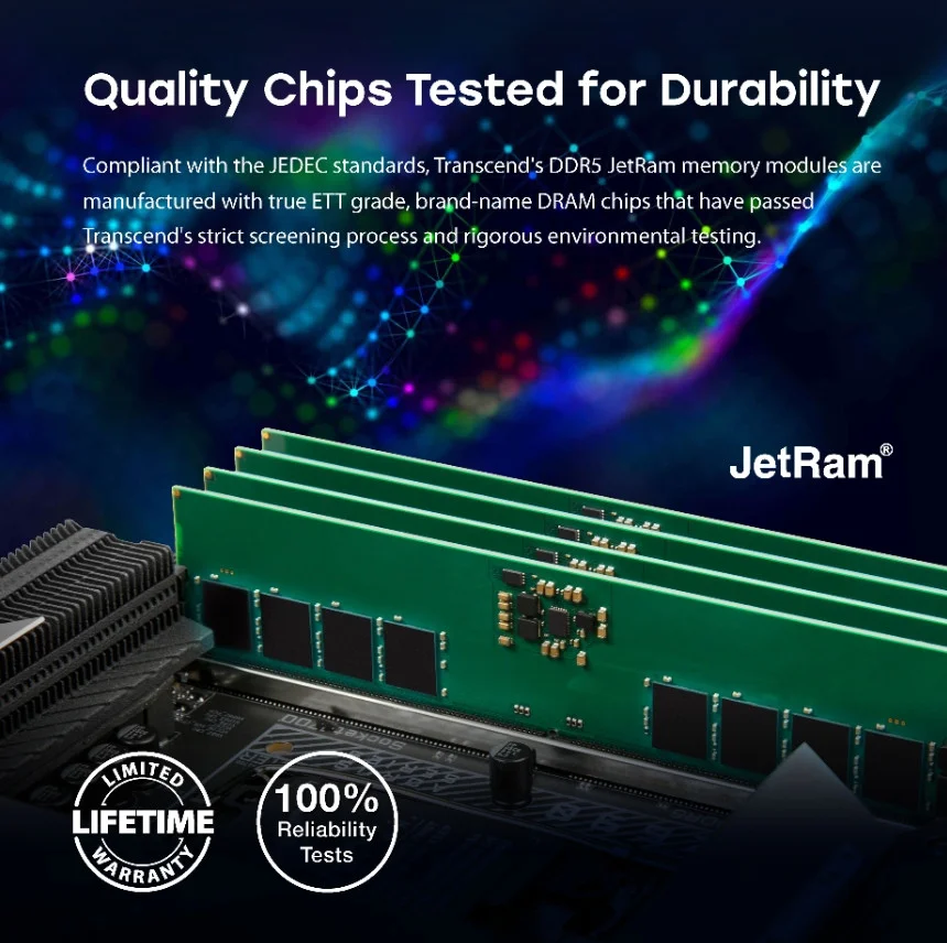 JEDEC standartlarıyla uyumlu olan Transcend'in DDR5 JetRam bellek modülleri, Transcend'in sıkı eleme sürecinden ve titiz çevresel testlerden geçen gerçek ETT sınıfı, marka DRAM yongalarıyla üretilmiştirTEKNİK ÖZELLİKLER
